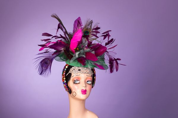 A super fun, bedazzled jeweled headband on a green Kentucky Derby fascinator that truly dazzles. Step into the spotlight with this uniquely vibrant accessory, featuring an eye-catching blend of assorted burgundy feathers and one standout pink feather that adds an unexpected twist. Designed for the fashion-forward and Derby enthusiasts alike, this lightweight, green fascinator exudes playful elegance and bold sophistication, making it the ultimate statement piece for Derby Day and upscale events. With its intricate detailing and radiant sparkle, Angie's one-of-a-kind creation is a true masterpiece that ensures you capture every gaze at Churchill Downs and beyond.